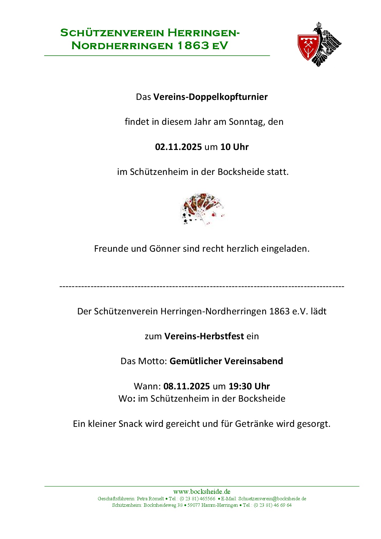 in der Bocksheide unser jährliches Doppelkopfturnier statt. Startgeld 5 Euro.