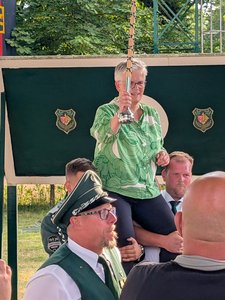 Zuvor wurde um die Isignien geschossen. Arjun Josefowski, der zusammen mit Leilah Ekinei das scheidende Königspaar bildete, sicherte sich mit dem 14. Schuss den linken Flügel und mit dem 84. Schuss das Zepter. Auch Jan Kottrup (Krone / 52. Schuss), Florentine Milk (Fass / 73. Schuss), Niklas Zott (Apfel / 77. Schuss) sowie Finn Petri (rechter Flügel / 104. Schuss) trugen sich in die Liste der Insignieneschützen ein.